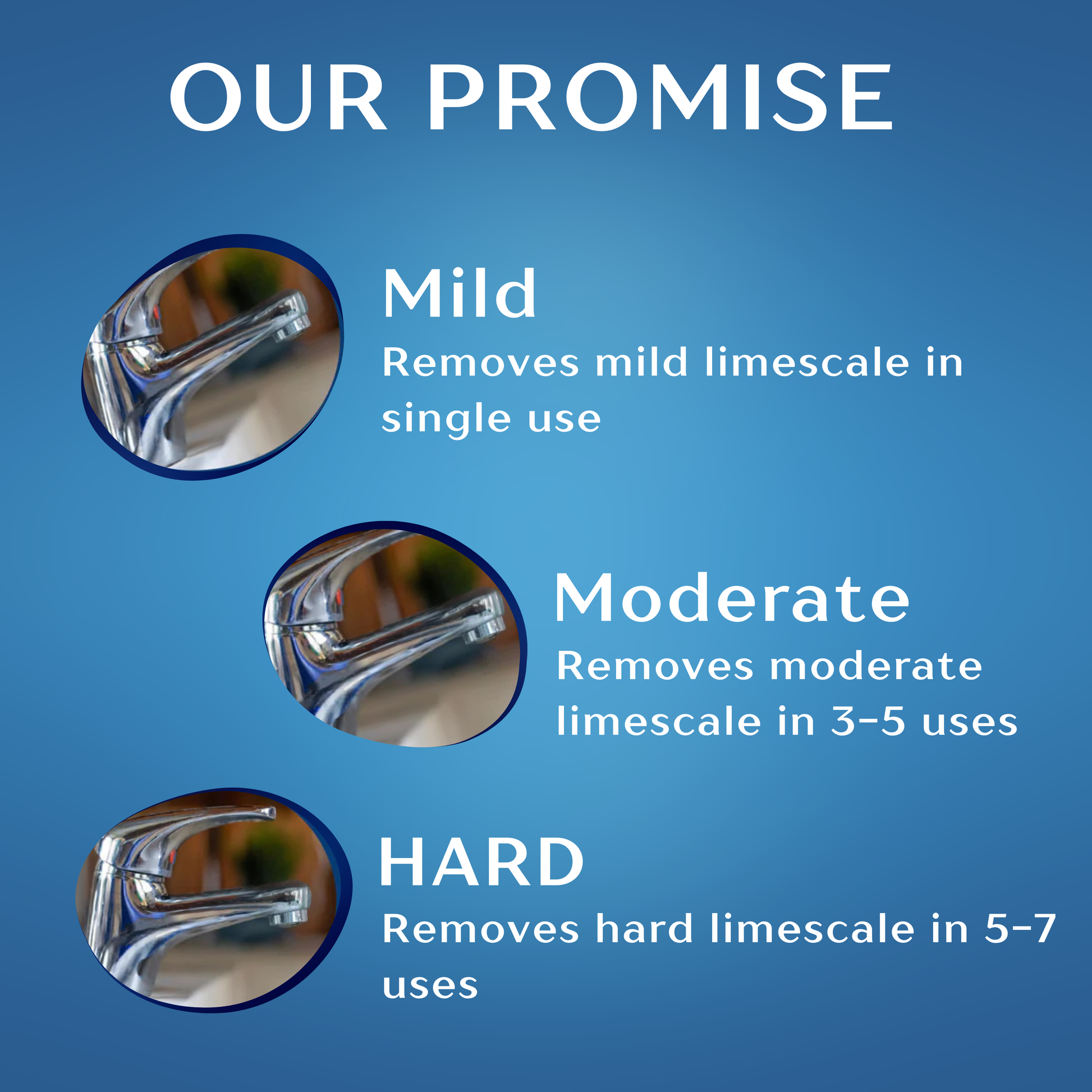• Hard water stains and limescale make taps, tiles, and bathroom fittings look dull.